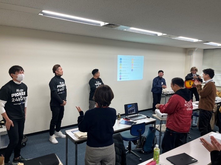 今回は三和(COZY)さんの歌とギターに合わせて小林さんとエニタイムフィットネスの皆さんがお手本を披露しました。エニタイムフィットネスの皆さんは今まで何十回も各地で体操を教えているそうです。お手本を見た後、講習会の参加者たちも実際に踊りました。私も踊ると体がとても温まり、今後もやってみたいと思いました。