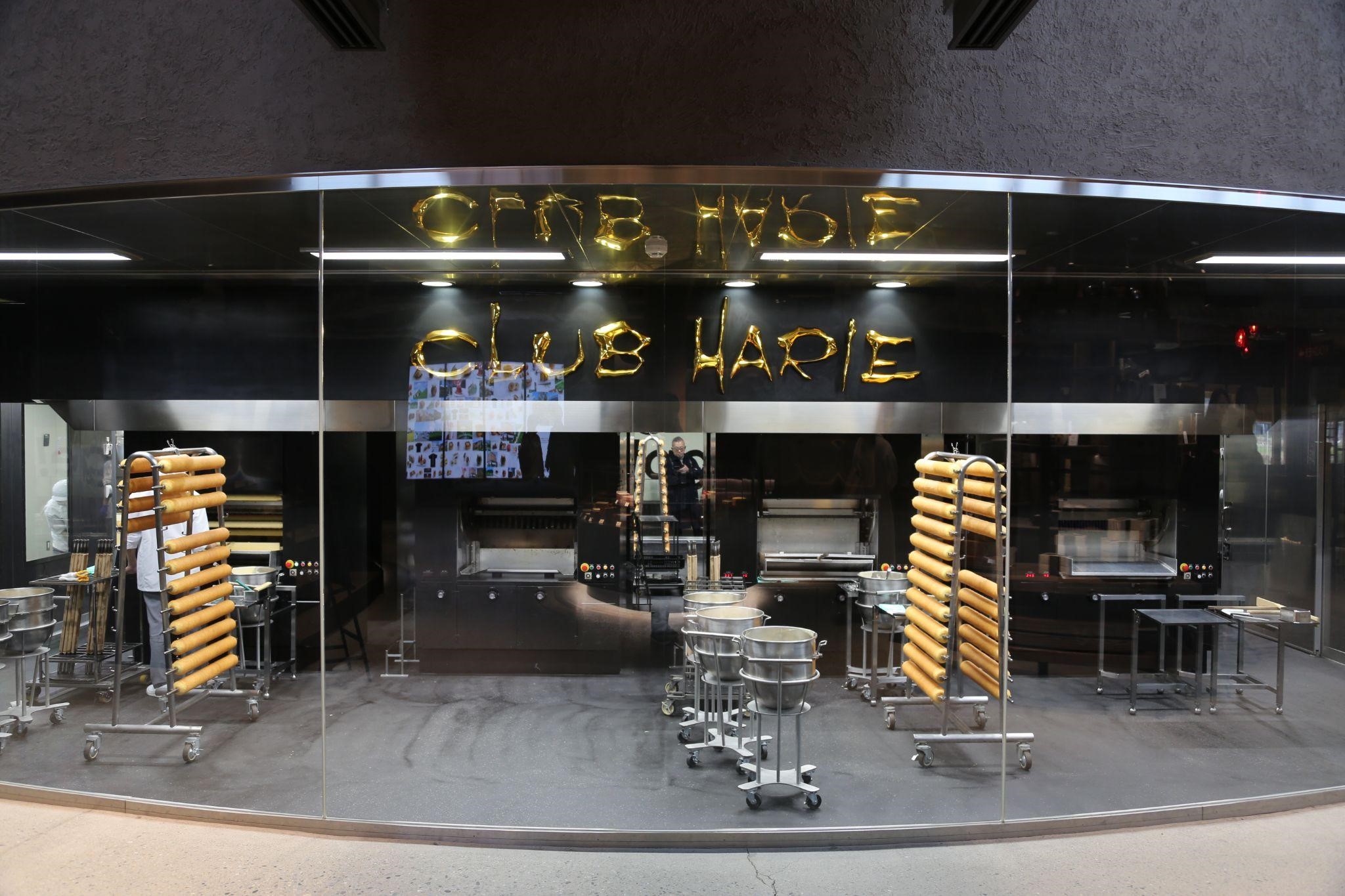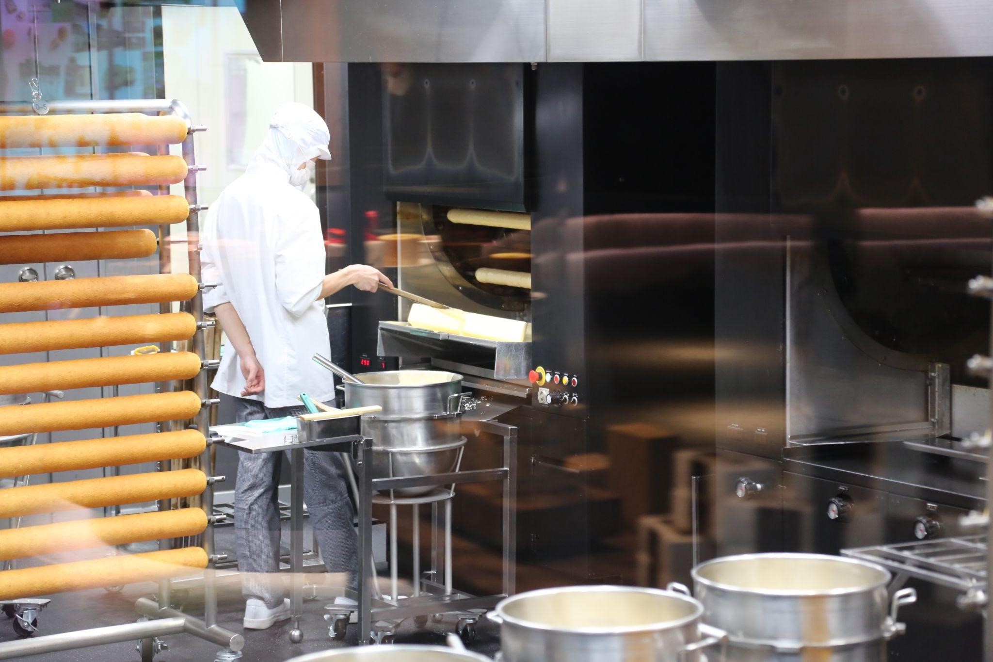 敷地内には、季節の和菓子を販売するショップやカフェのほか、クラブハリエの主力商品であるバームクーヘンの生地づくりや焼くところを間近で見学できるバームファクトリーもあります。できたてのバームクーヘンをお召し上がりいただけるカフェも併設していて、多くのお客さまに楽しんでいただいています。
