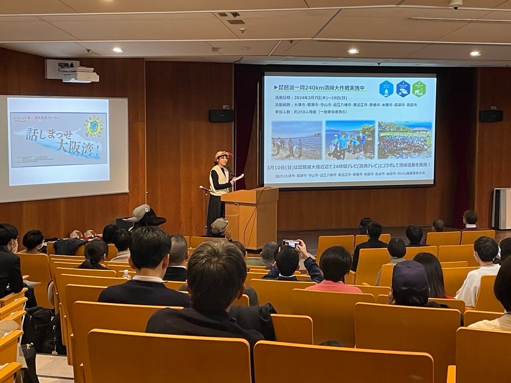 そしてこの第4部の最後に、私からMLGsの紹介と、MLGsに関連したIVUSAの活動についての話をさせて頂きました。IVUSAでも海ゴミプロジェクトを全国各地で実施しており、大阪湾の海ゴミを減らそうと大阪環状線一周清掃大作戦や上流の琵琶湖で琵琶湖湖岸清掃活動を実施していることを紹介しました。また、”びわ湖の研究者になろうツアー”という子ども向けの環境学習イベントについても紹介し、浄水場、水と生き物、水と暮らしなどのテーマで開催する中で、子ども達が身近な琵琶湖の山、川、湖の水、暮らし、生き物の繋がりに探究心、好奇心を持っており、今後淀川や大阪湾などへの繋がりにも目を向けていく事への期待を話しました。