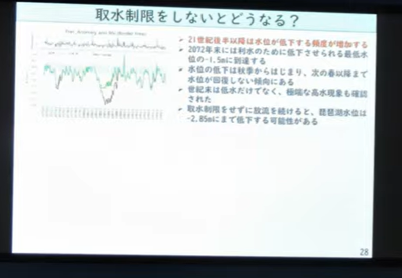 印象的だったのが、将来の「もしも」のお話です。気候変動が起こっている将来、もしも今のダムの能力で、今と同じ水の量を使用し続けたら…琵琶湖の水位は簡単にマイナス90センチを超えてしまうそうです。もしも需要に応えるだけ、水を流し続けたら…マイナス3メートルとなり、色んな生物が死んでしまいます。