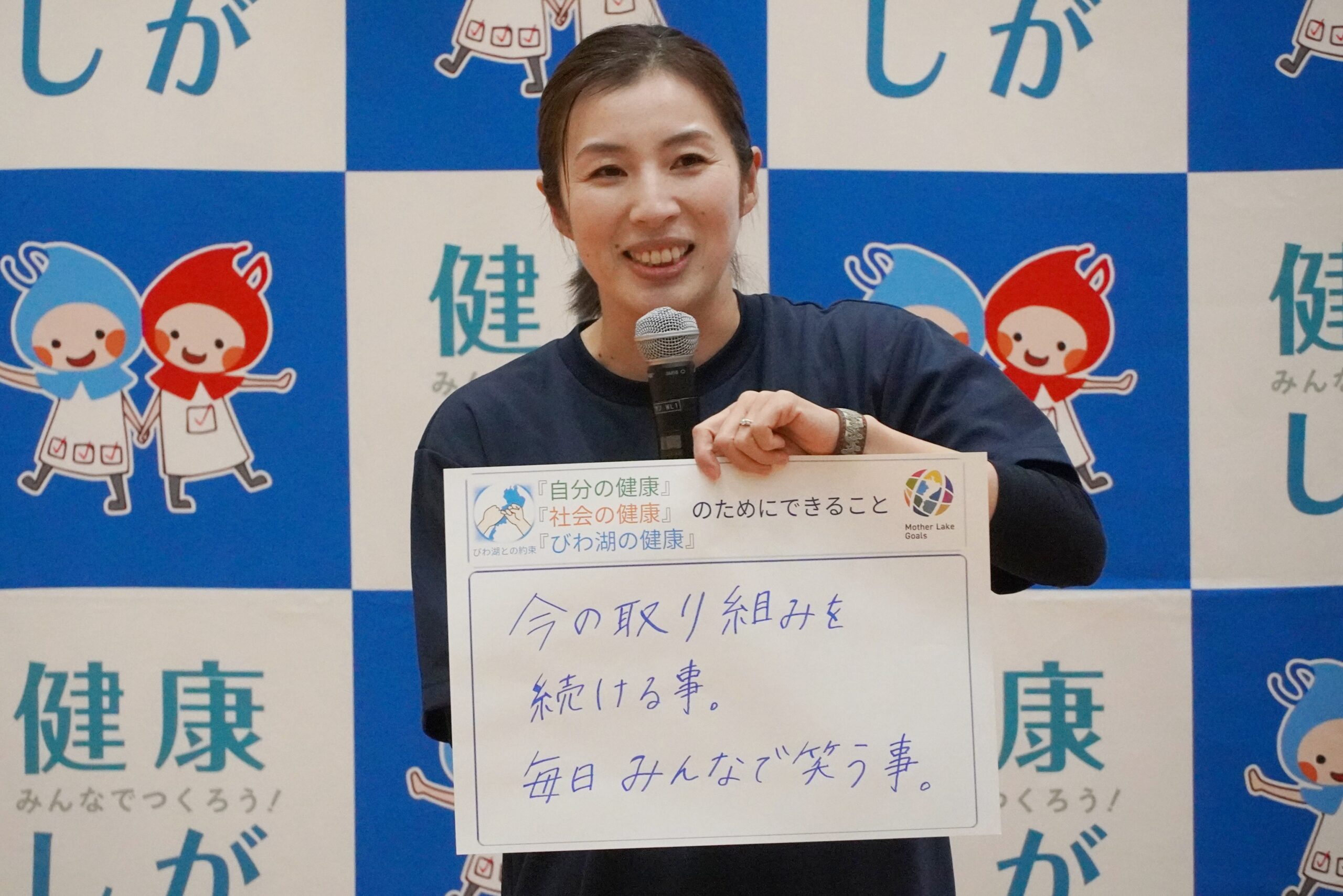 講演の最後には、伊藤さん自身が現在取り組んでいることを「できるだけ長く続けること」を「びわ湖との約束」として紹介しました。小さな一歩を積み重ねることの重要性を伝え、参加者一人一人が、自身の健康と琵琶湖の健康につながる行動を考えるワークショップも行われました。