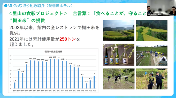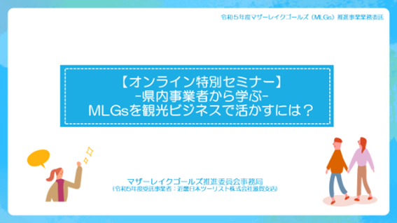 このセミナーは、MLGsを観光ビジネスとして展開されている県内企業(琵琶湖ホテル/BSCウォータースポーツセンター)より、MLGsに関するお話をお伺いし、「MLGs」を活かすことでビジネスチャンスに繋がる可能性を模索する機会として開催されました。