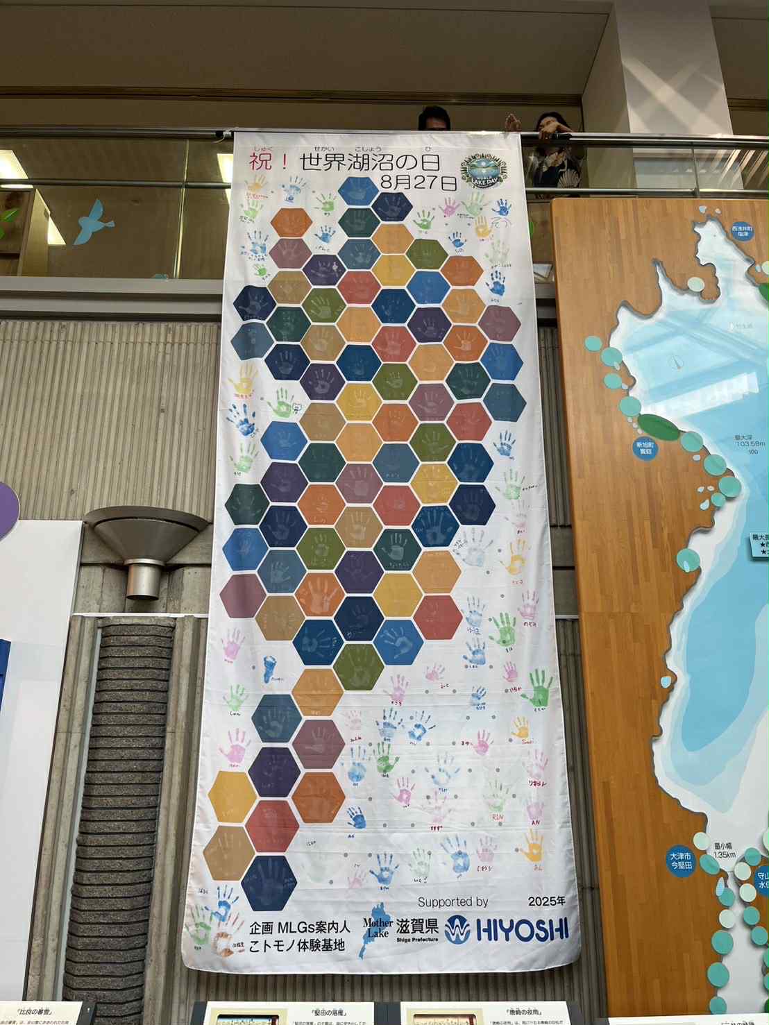 巨大タペストリーは、MLGsカラーで彩られた六角形を組み合わせてびわ湖を表現しています。