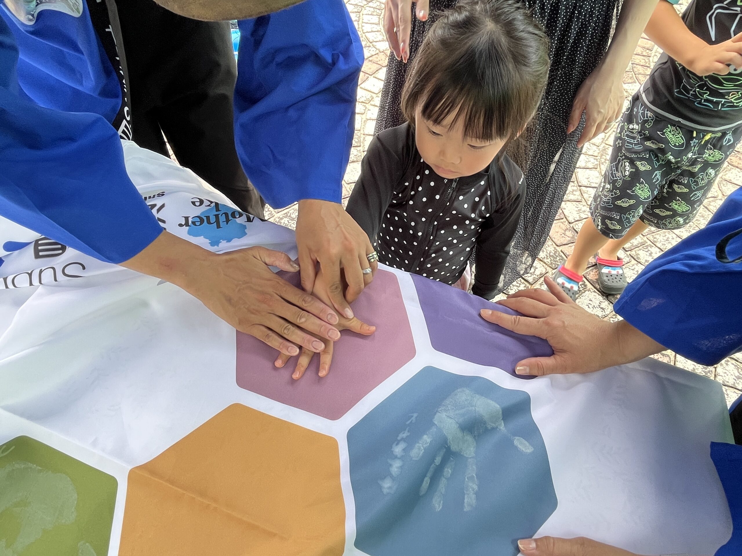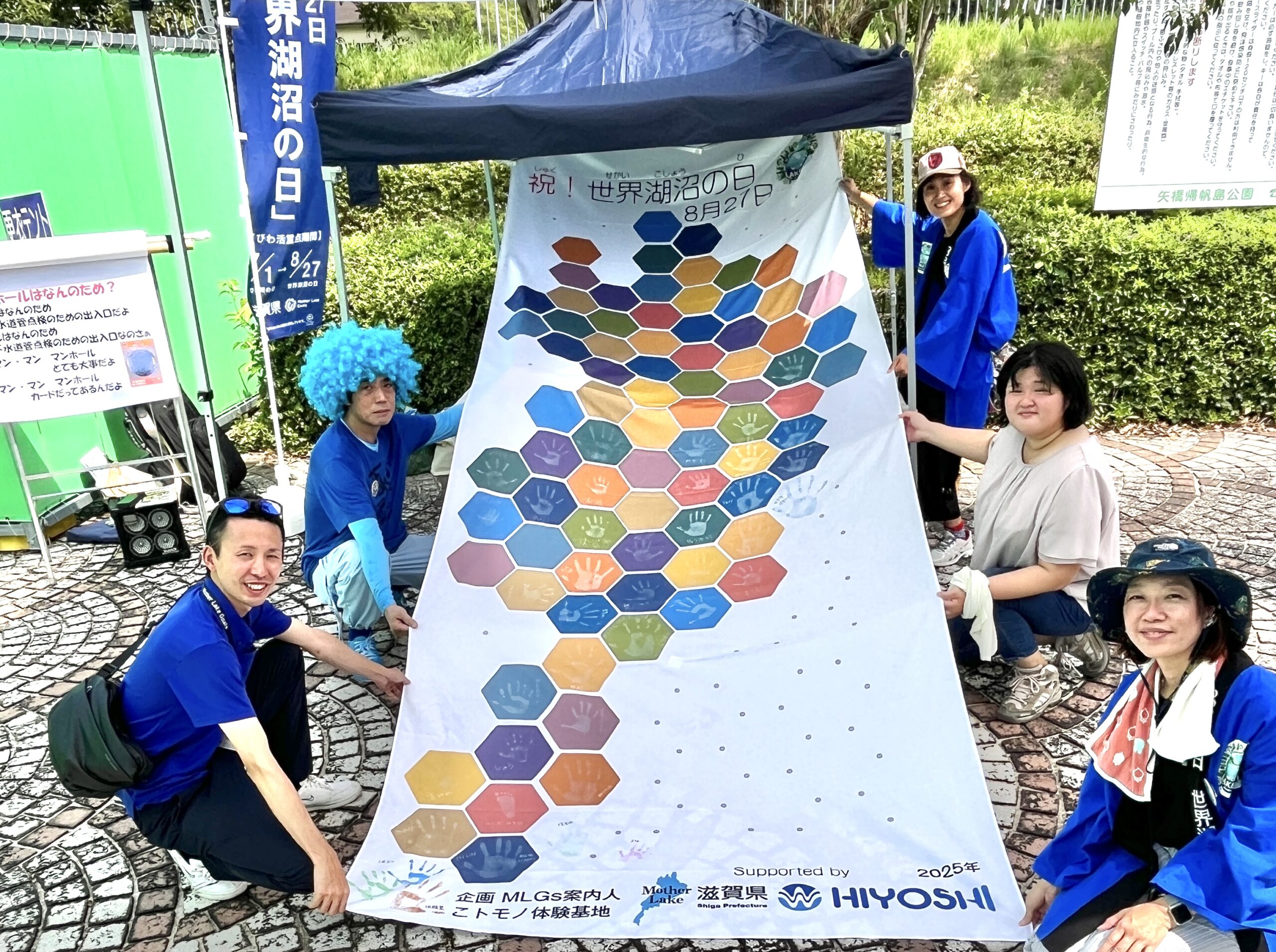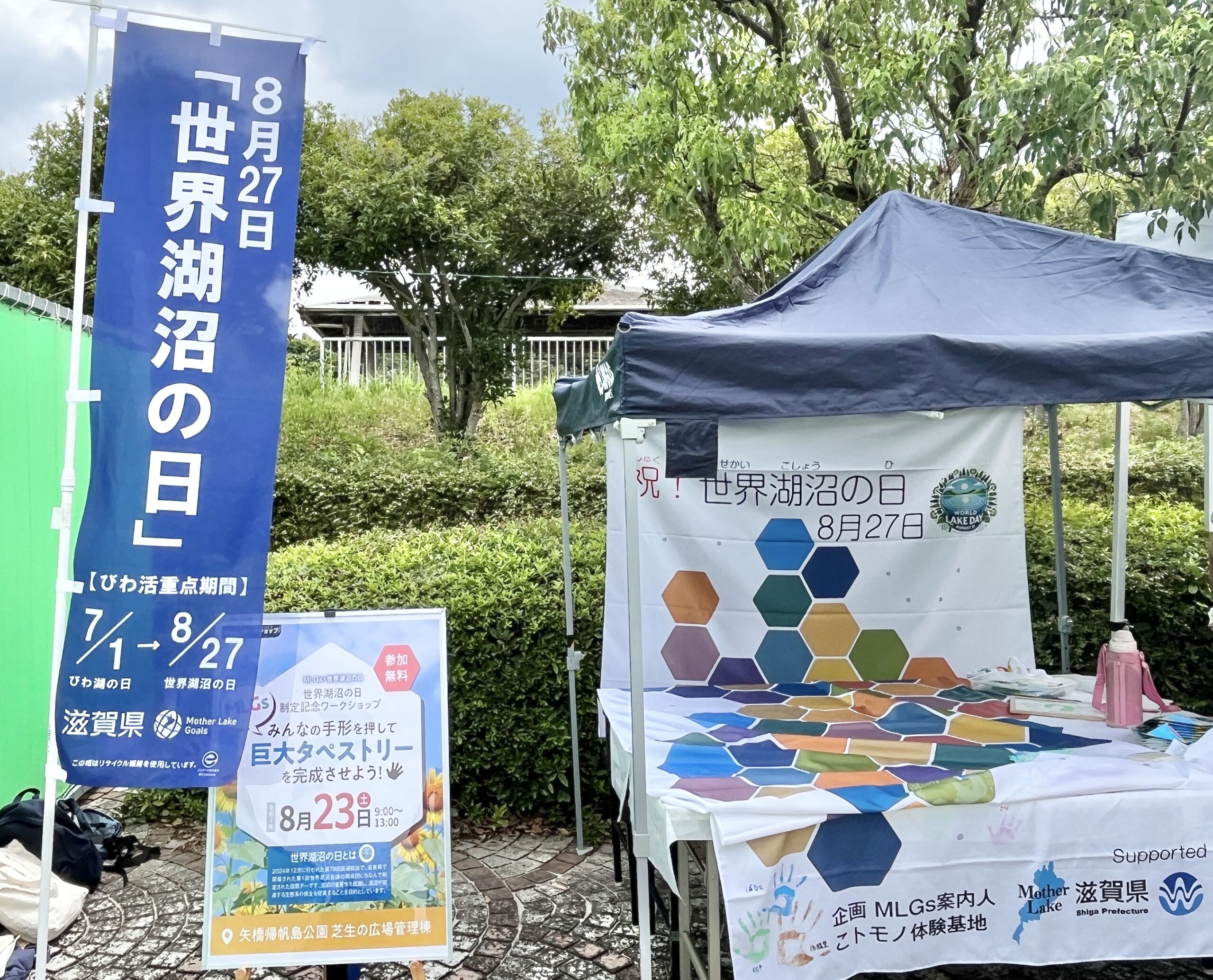 2025年8月23日(土)、草津市・矢橋帰帆島公園で「みんなの手形を押して巨大タペストリーを完成させよう!」(主催:こトモノ体験基地、マザーレイクゴールス推進委員会 協賛:株式会社日吉)のワークショップが開催されました。