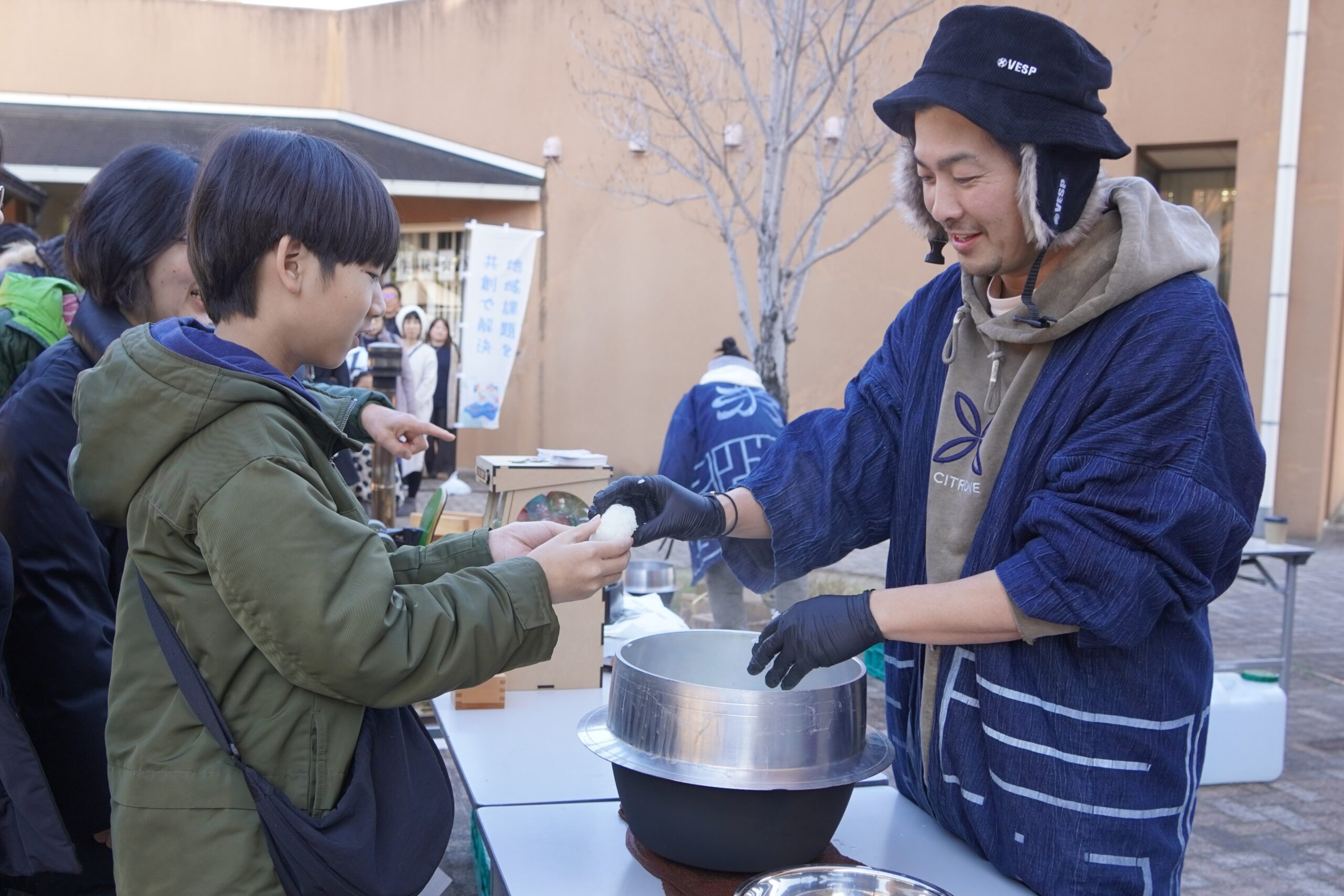 カフェテリア前では、RICE IS COMEDYによるゲリラ炊飯が行われ、羽釜と薪で炊き上げた米をおにぎりにして、参加者に振る舞う企画も展開されました。