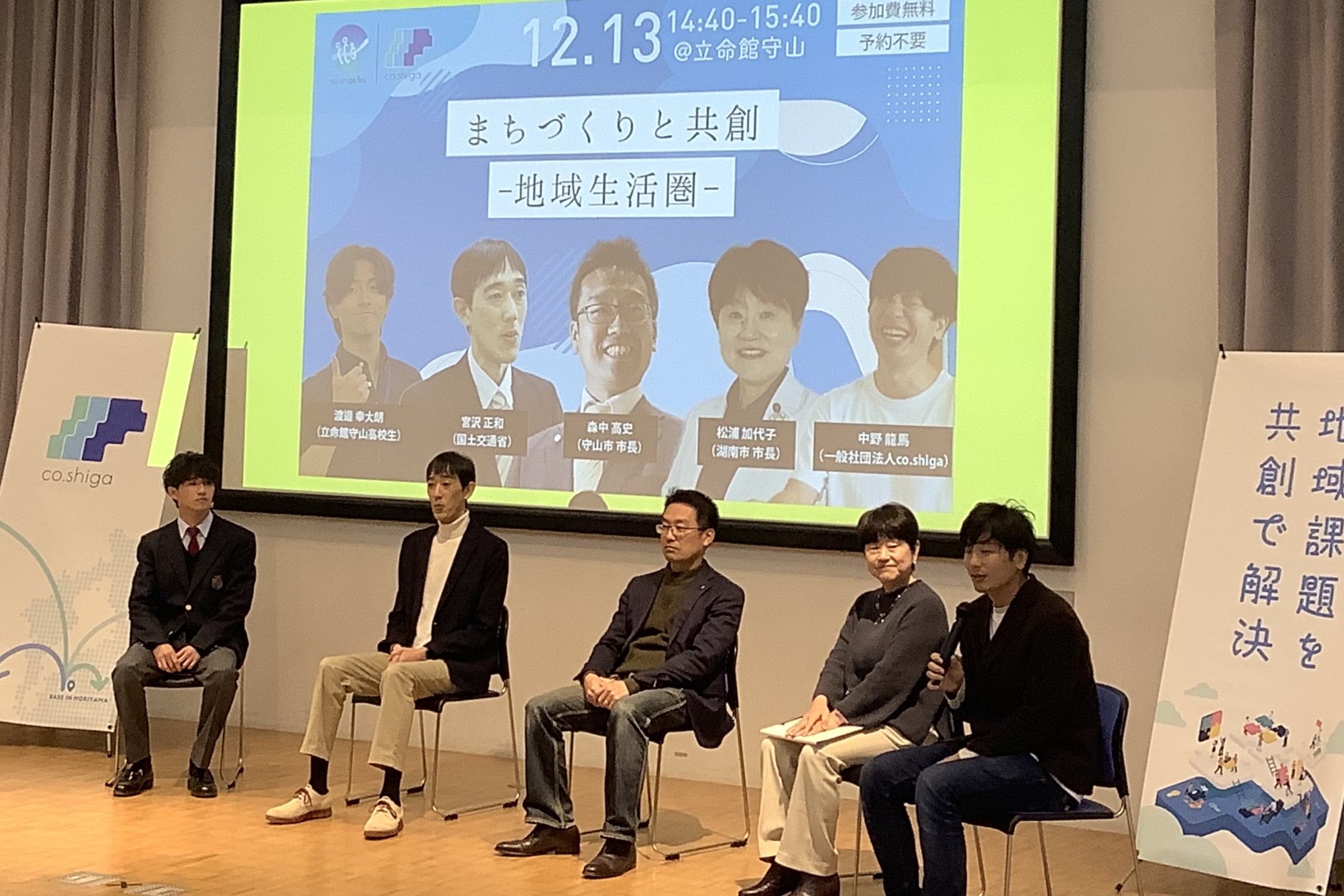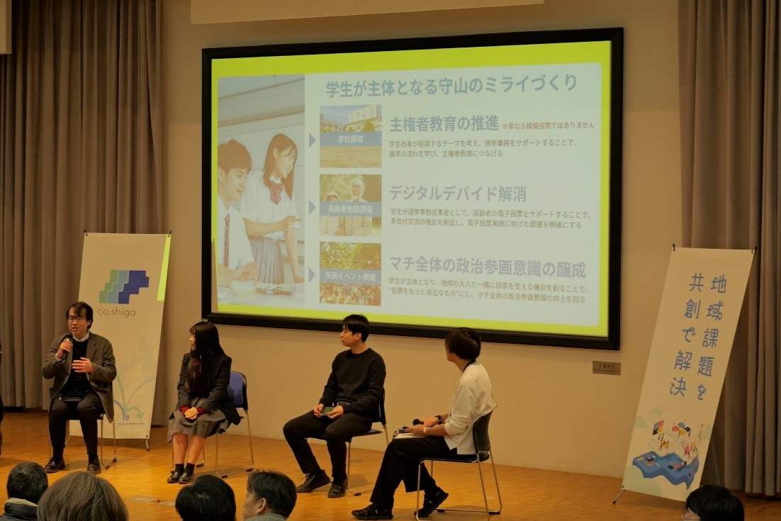 「まちづくりと共創-地域生活圏-」では、少子高齢化や交通、産業、人材、暮らしの質など、複雑化する地域課題に対し、行政、民間、市民が立場を超えて関わる共創の重要性が語られました。守山市長、湖南市長、国土交通省の宮沢正和さん、立命館守山高校生が登壇し、持続可能なまちづくりに向けた新たな共創の形について具体的に掘り下げました。
