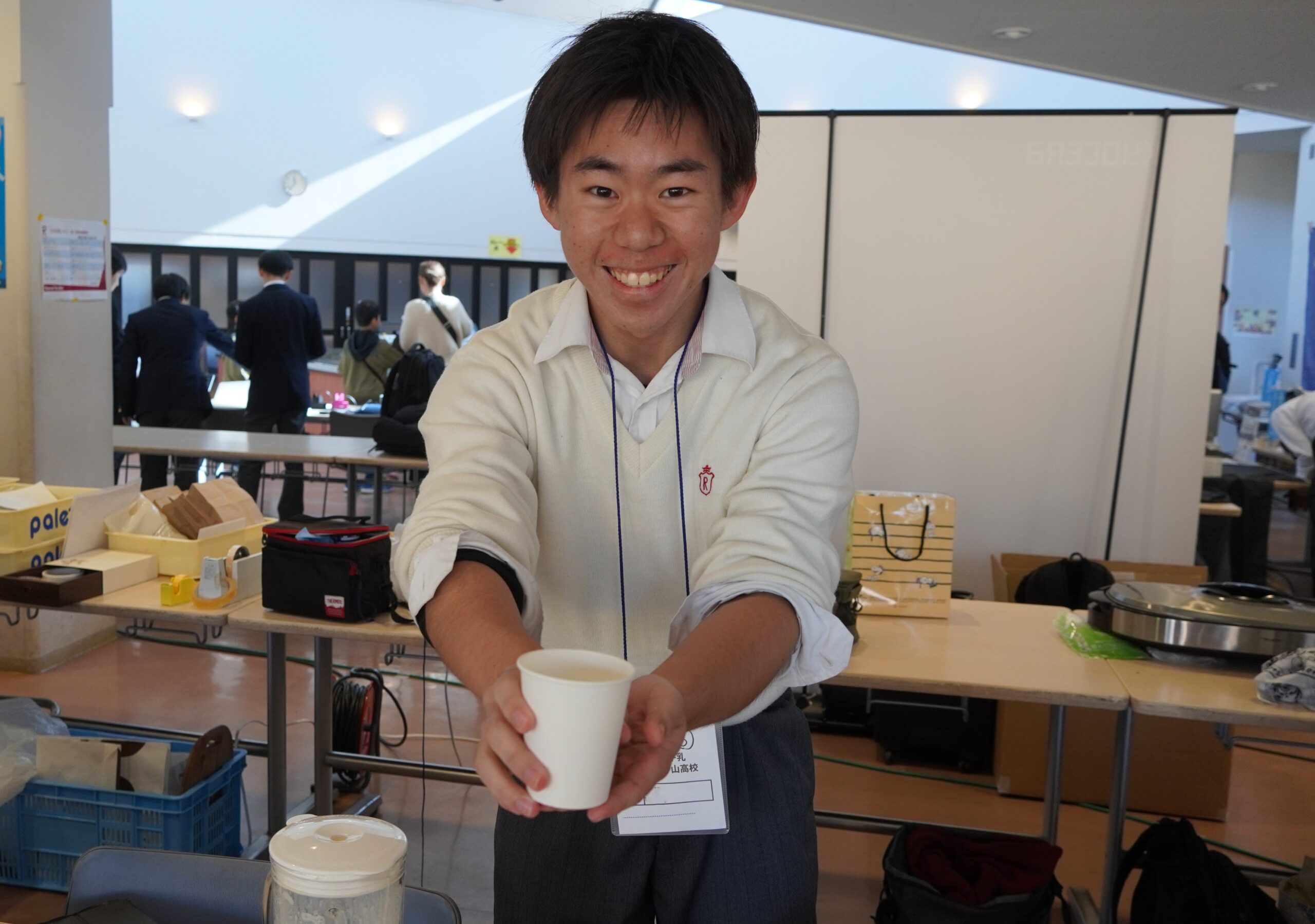 出店ブースでは、フードロスについて調べた立命館守山高校の生徒が、パン餃子や食パンの耳を使ったクリスマススイーツを販売しました。また、探究学習から生まれたアレルギー対応カルシウム補給ドリンク「ほぼ牛乳」も販売されました。