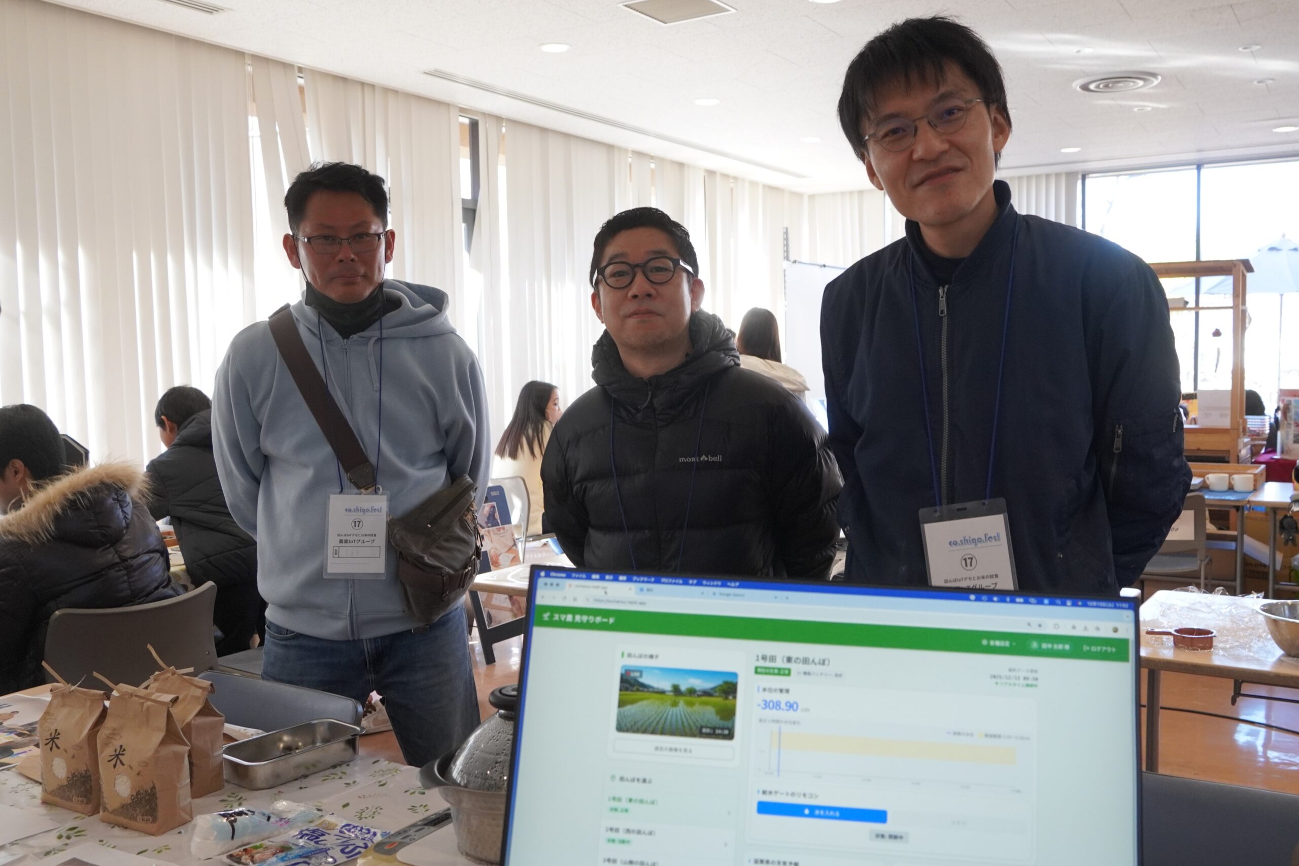 技術を活用して農家の水田管理を支援するコミュニティベースの農業用水管理システム「田んぼIoT」のデモ展示と、IoT米の試食も行われました。