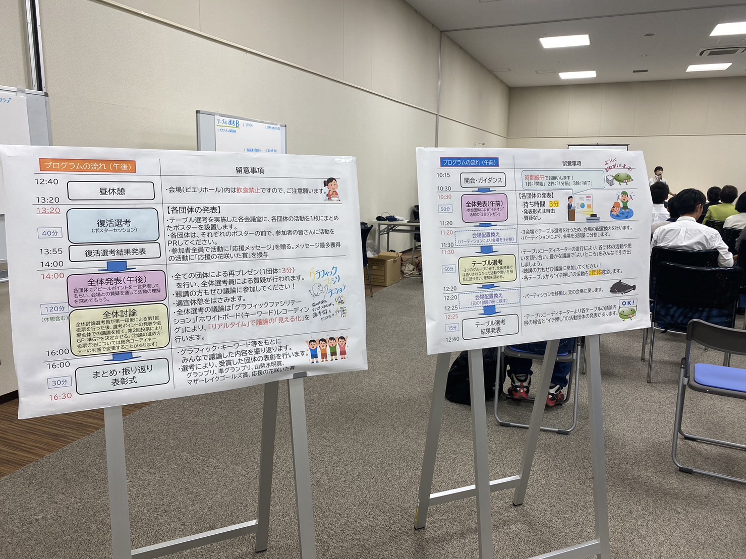 全体発表が終わると5,6団体ごとにテーブルを分け、そのテーブル毎に一押しの団体2つ選出するテーブル選考に移りました。この選考では長所を評価する加点方式がとられています。ここでは選考も行いつつ、活動がさらに良くなるための意見交換も行われました。