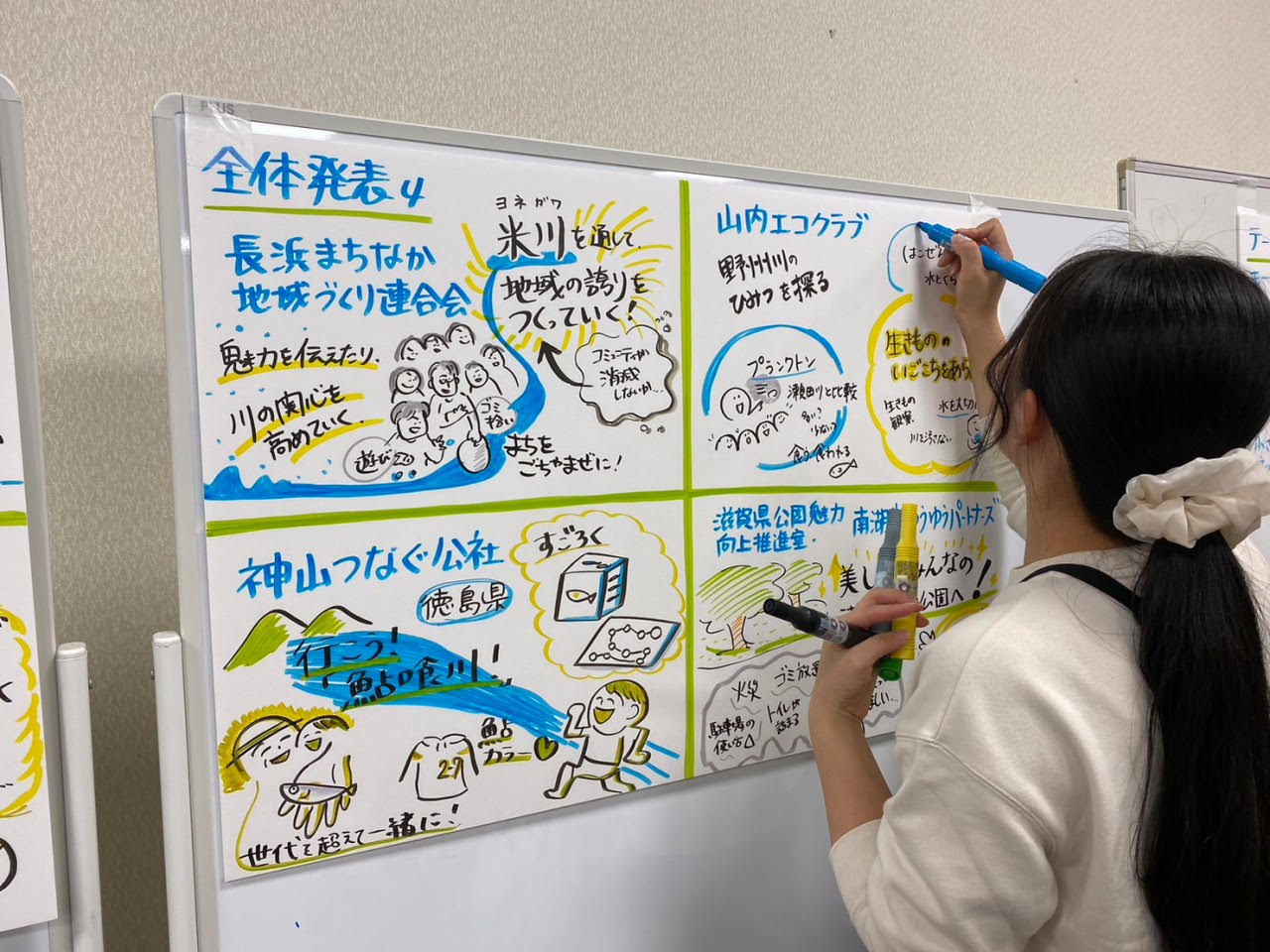 まず、全体発表が始まりました。各団体3分の持ち時間の中で自分たちの活動をポスターや実際の制作物を用いて紹介していきます。紹介された内容をすぐにイラストにし、わかりやすく伝えるグラフィックファシリテーションも行われており、各団体の活動や議論の”見える化”がされることで、さらに深い議論ができました。
